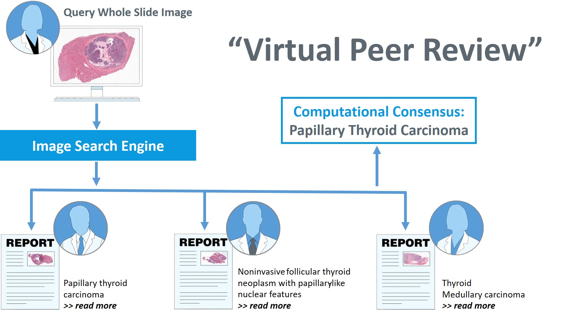 Whereas AI involving classification and segmentation methods has obvious benefits for image analysis, image search represents a fundamental shift in computational pathology. Using image search, pathologists can match the pathology of new patients with already diagnosed and curated cases, offering a new approach to improve diagnosis through visual inspection of similar cases and computational majority vote for consensus building.